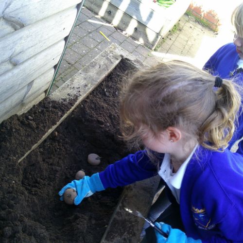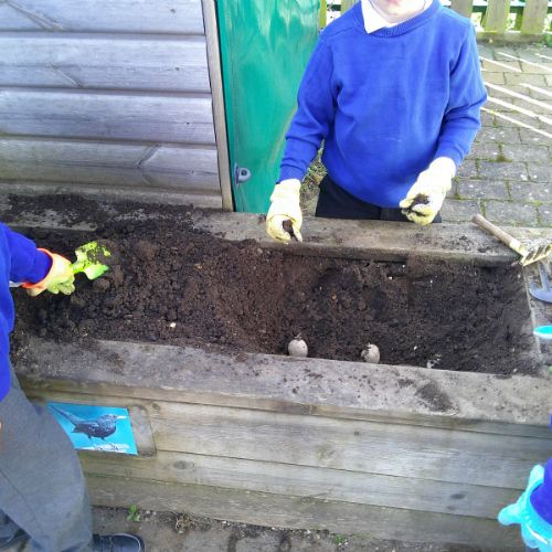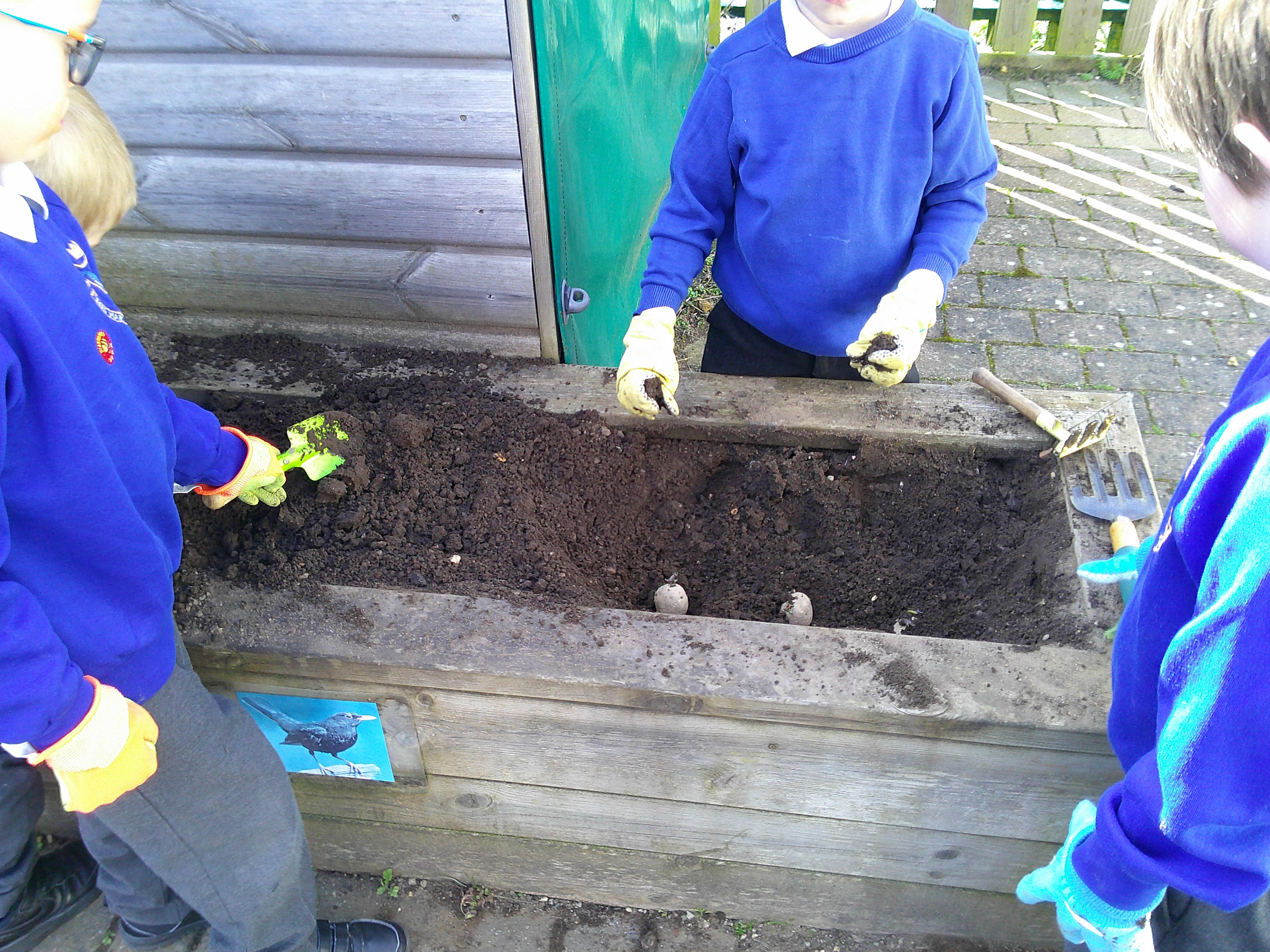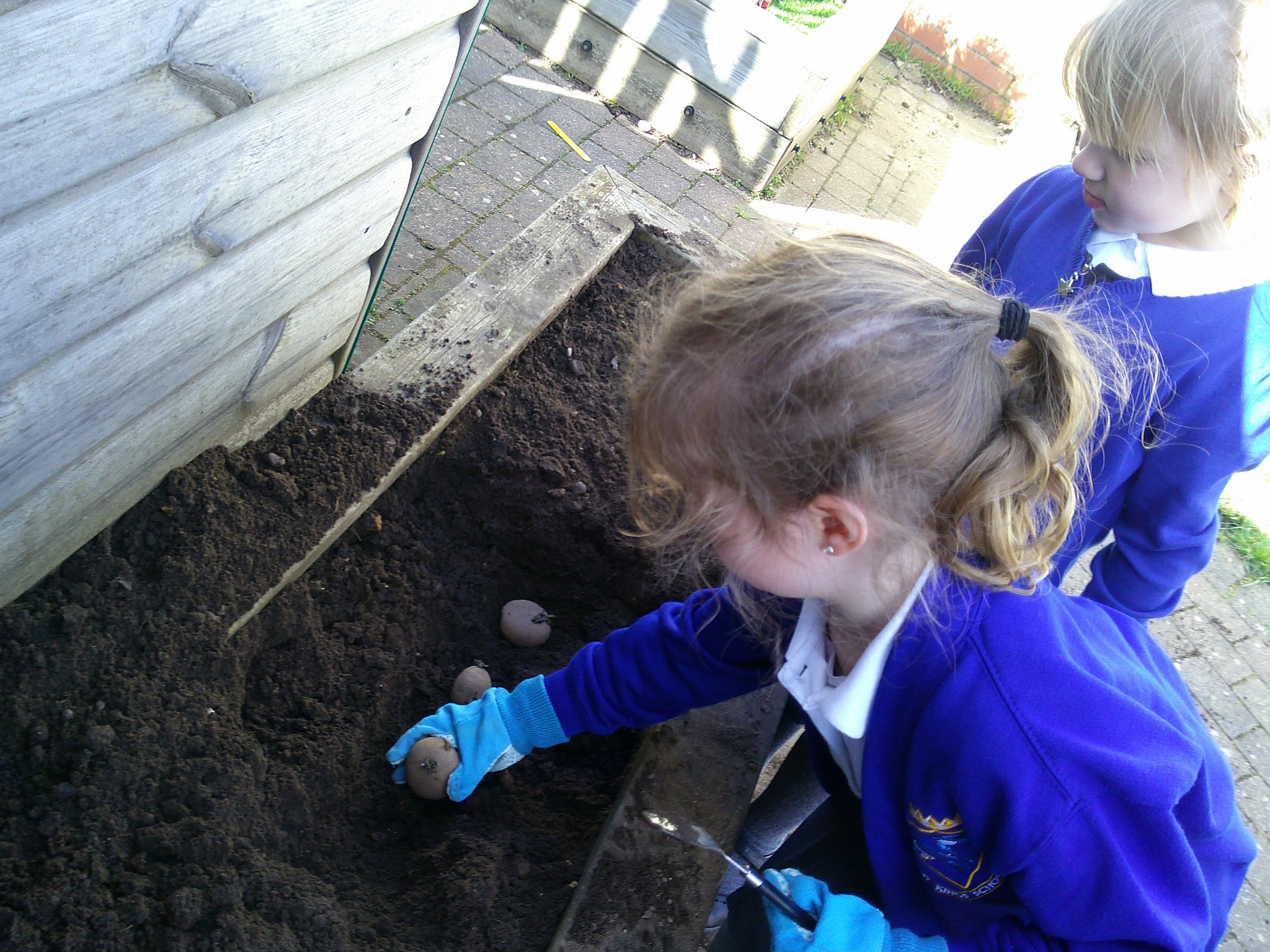 We got wonderfully muddy planting potatoes. Now we just need water, sunshine and plenty of patience!